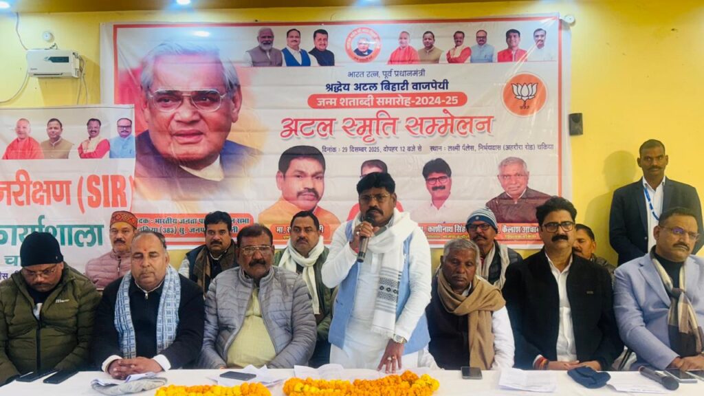 भारत रत्न, पूर्व प्रधानमंत्री श्रद्धेय अटल बिहारी वाजपेयी जी की जन्म शताब्दी समारोह के अंतर्गत रविवार को लक्ष्मी पैलेस, निर्भयदास (अहरौरा रोड), चकिया में अटल स्मृति सम्मेलन का आयोजन किया गया। कार्यक्रम का शुभारंभ दोपहर 12 बजे हुआ।