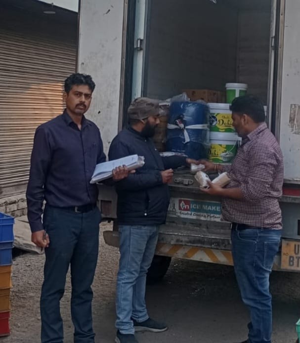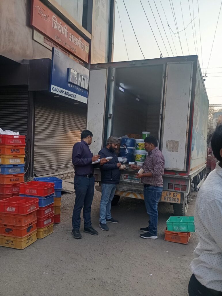 साथ ही वितरण वाहन से ही फुल क्रीम दूध ब्रांड मॉडर्न फ्रेश का नमूना संग्रहित किया गया। खाद्य कारोबार करता को फूड ग्रेड प्लास्टिक के डिब्बों में खाद्य पदार्थों के भंडारण हेतु निर्देशित किया गयाl