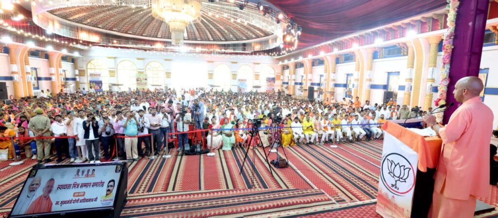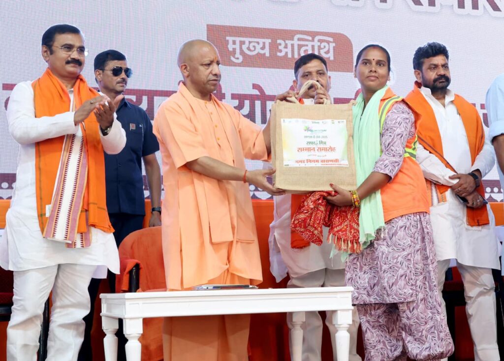 सीएम योगी सोमवार को सरोजा पैलेस, पिपलानी कटरा में स्वच्छता मित्र सम्मान समारोह में शामिल हुए। उन्होंने स्वच्छता ही सेवा पखवाड़ा के अंतर्गत उत्कृष्ट योगदान करने वाले स्वच्छता मित्रों का सम्मान और स्वच्छता किट का वितरण किया। सीएम ने सफाईमित्रों पर पुष्पवर्षा भी की। एक बच्ची ने सीएम के साथ फोटो भी खिंचवाई।
